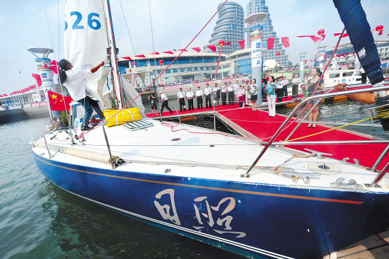 8月16日,翟墨驾驶“日照”号无动力帆船停靠进日照市万平口海湾码头。 新华社记者 李紫恒 摄