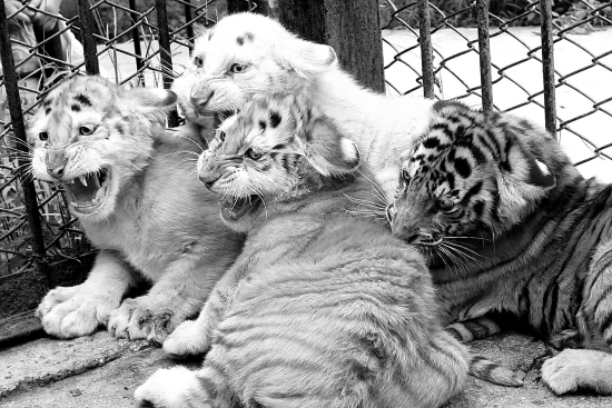 | 8月21日,济南野生动物世界的“多肤色”四胞胎小虎喜过百日,动物世界的工作人员为它们准备了丰盛的鲜肉大餐。今年五月,五岁的孟加拉虎“虎妞”产下一只雪虎、两只金虎和一只孟加拉虎。像这样由一只母虎一胎产下三种“肤色”四胞胎虎崽实属罕见。新华社发 |