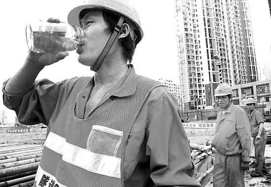 地铁工人在工地上喝水解渴,盛夏时节,各级政府纷纷将“高温关怀”政策放在重要位置。体现社会进步和民生改善的指标在干部考核体系中权重增加,涵盖了很多导向性的信息。新华社发