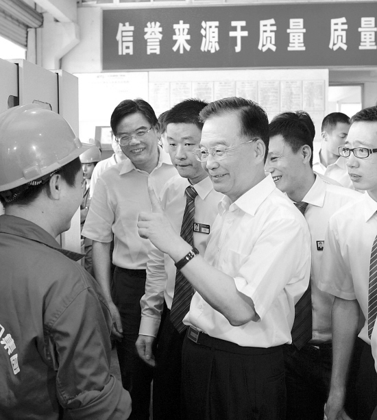右图:8月23日,中共中央政治局常委、国务院总理温家宝在温州考察民营企业时亲切勉励企业员工坚定信心,鼓足干劲。