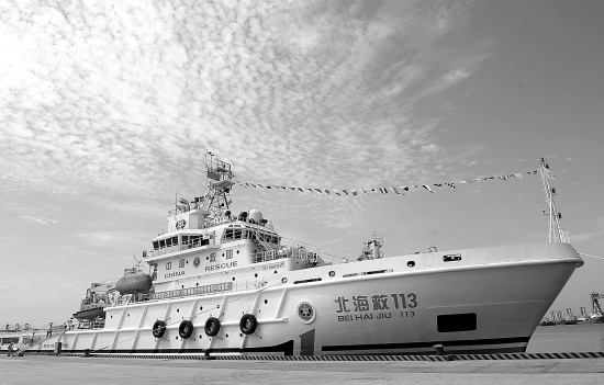 | 新型全天候远洋专业救助船 8月24日,交通运输部北海救助局在山东烟台为“北海救113”轮举行列编仪式。“北海救113”轮是一艘新型的全天候远洋专业救助船,可抗12级大风,续航力达1万海里,可搭载获救人员百余人,并配有功能强大的通信设备和对外消防系统,还增加了直升机起降平台及配套设施,可以更好地开展海空立体救助。“北海救113”轮交付使用后,将奔赴渤海湾执行24小时海上救助值班待命任务。 新华社发 |
