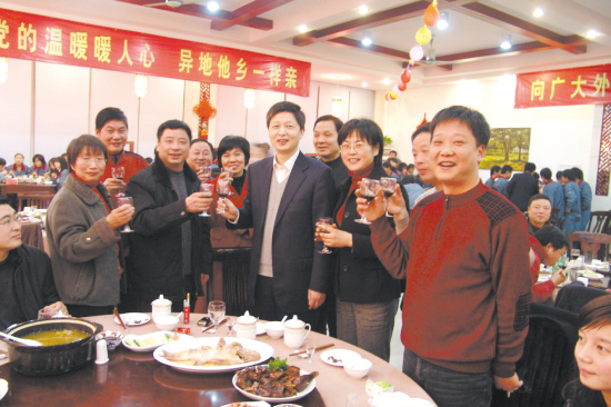 义乌市委、市政府高度重视工会建设,关心关怀外来务工人员在义的工作、生活及权益维护。图为2009年春节,义乌市委书记吴蔚荣、义乌市总工会主席陈有德等来到华鼎绵纶公司,与该企业留厂过年的员工共吃年夜饭,共庆新春佳节。