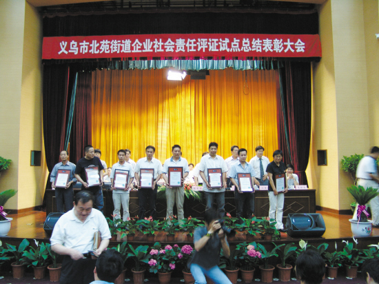 2009年5月22日,义乌市总工会召开企业社会责任评证试点总结表彰大会,义乌14家企业成为首批“最具社会责任企业”,同时,还发布了《义乌市企业社会责任蓝皮书》。这标志着企业社会责任“义乌标准”进入正式实施阶段。