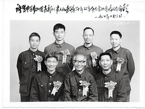 ↑ 1983年6月,石重海(后排左二)与同事共获“园丁”纪念章时的合影。