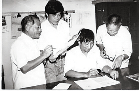 ↑ 1992年,石重海(右二)在诸暨市教育局督导室与同事交流工作。