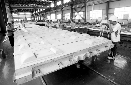 8月25日,中铁十局嘉兴轨道板场的技术人员正在查验完工的首批轨道板。当日,沪杭高铁首批80多块轨道板在中铁十局嘉兴轨道板场的第一条生产线上下线。