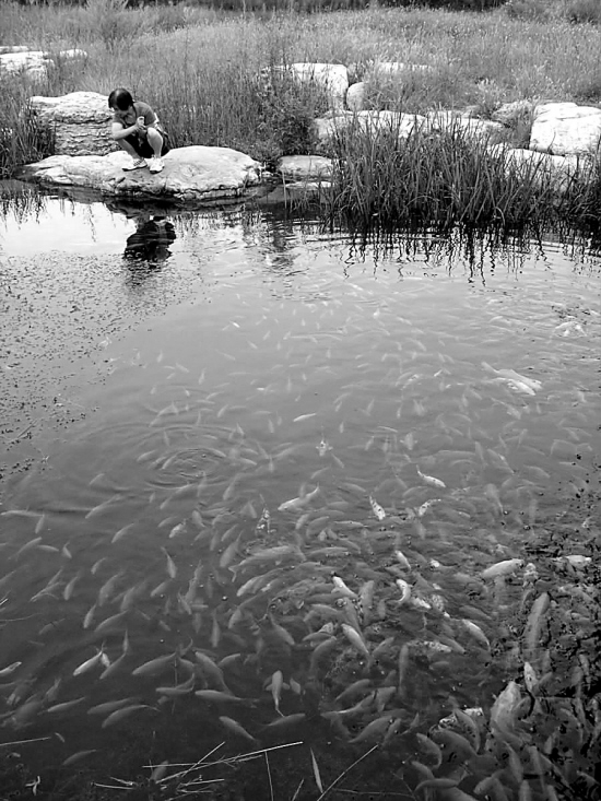 图为8月29日,附近居民在奥林匹克森林公园北部园区赏鱼。 新华社记者 唐师曾 摄