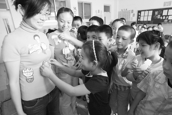 学生们把自己制作的“育人奖章”颁发给喜欢的老师,老师批评学生时应激发其上进心,是一门艺术。新华社发