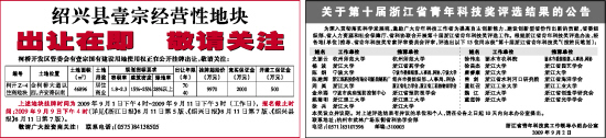 上述地块挂牌时间为2009年9月1日下午4时~2009年9月11日下午3时(工作日),报名截止时间:2009年9月9日下午4时(详见《浙江日报》8月11日第5版、《绍兴日报》8月11日第7版、《绍兴县报》8月11日第7版)。