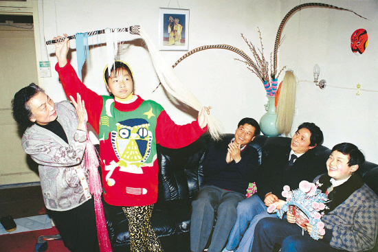 ↑ 张娴在指导晚辈学戏。