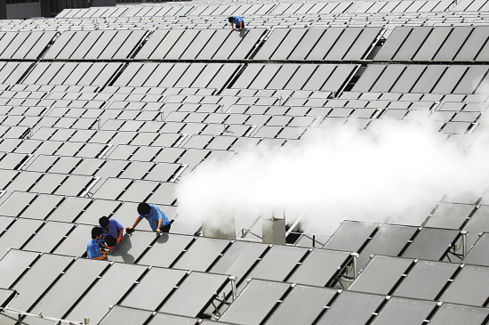 | 维修人员正在位于萧山区的达利(中国)有限公司印染车间屋顶维护太阳能板。达利公司投资1200多万元引进大规模平板太阳能集热器加热生产用水,面积达1.3万平方米,有两个足球场大。据测算,此举取代燃煤每年能节约1300吨标准煤,节约费用达130多万元。记者 吴元峰 通讯员 丁力 摄 |