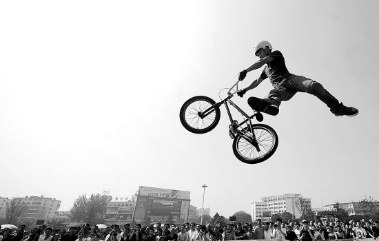 图为BMX小轮车特技表演。惊险刺激的轮滑、BMX小轮车、滑板表演充分展现了极限运动潮流时尚的街头魅力。