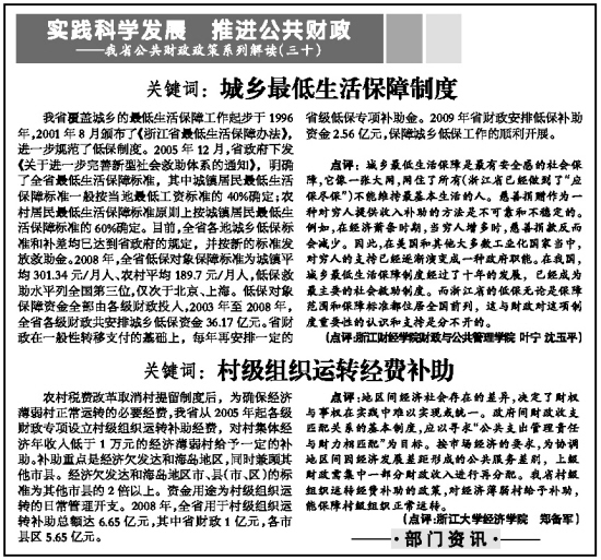点评:城乡最低生活保障是最有安全感的社会保障,它像一张大网,网住了所有(浙江省已经做到了“应保尽保”)不能维持最基本生活的人。慈善捐赠作为一种对穷人提供收入补助的方法是不可靠和不稳定的。例如,在经济萧条时期,当穷人增多时,慈善捐款反而会减少。因此,在美国和其他大多数工业化国家当中,对穷人的支持已经逐渐演变成一种政府职能。在我国,城乡最低生活保障制度经过了十年的发展,已经成为最主要的社会救助制度。而浙江省的低保无论是保障范围和保障标准都位居全国前列,这与财政对这项制度重要性的认识和支持是分不开的。