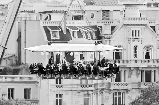 9月11日,在法国巴黎,人们在距离地面50米的“空中餐厅”享受晚餐。此次活动由一家饮食杂志组织发起,每次可接待22人同时用餐,活动预计持续5天。