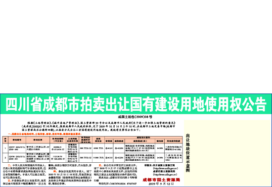 根据《土地管理法》、《城市房地产管理法》、国土资源部39号令以及成都市人民政府《关于进一步加强土地管理的意见》(成府发[2005]42号)文件规定,报经成都市人民政府批准,定于2009年10月14日上午10时,在成都市土地交易市场(成都市国土资源局办公楼附四楼),以拍卖方式出让二宗国有建设用地使用权。现就有关事项公告如下: