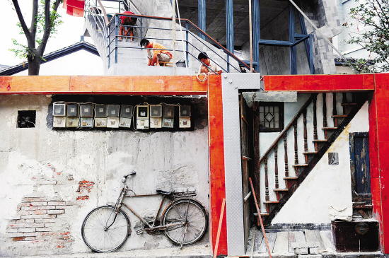 9月15日,一组由老墙头组成的文化墙出现在杭州中山路,老巷口的电表箱、巷子里的自行车、墙头上的标语等这些市民记忆都展现在眼前,给中山路增添了厚重的文化内涵。 本报记者 梁臻 摄