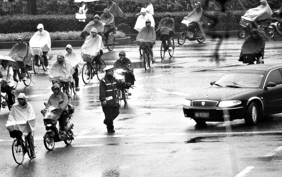 | 9月22日,杭城迎来第3个“无车日”。当天,许多市民选择自行车、公交车出行,马路上路况良好,公交车通行无阻。图为在延安路与体育场路交叉口,一位交警在阻止一辆违规车辆驶入限行区域。 吴元峰 梁臻 摄 |