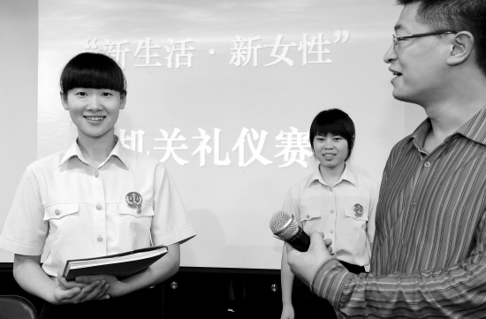 9月22日,杭州江干区人民法院的女法官朱若君(左)正在展示庭审礼仪。当天,江干区妇联组织开展迎国庆“新生活、新女性”机关礼仪赛,来自全区15家党政机关单位的42名巾帼