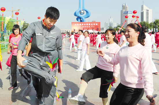 9月22日,刘翔(前左)在活动现场和志愿者一起踢毽子。当日,全国“全民健身志愿服务活动”启动仪式在济南市泉城广场举行,奥运冠军刘翔、高敏等与各界代表参加了启动仪式。 新华社记者范长国 摄