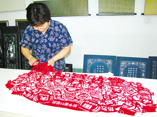 张秀娟正在创作剪纸《喜迎国庆》。