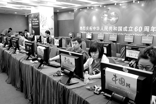 图为在新闻中心网络服务室,记者们正在上网查阅资料。