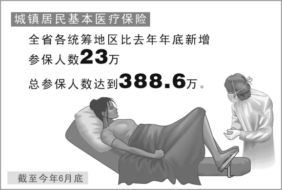 截至今年6月底,城镇居民基本医疗保险全省各统筹地区比去年年底新增参保人数23万,总参保人数达到388.6万。