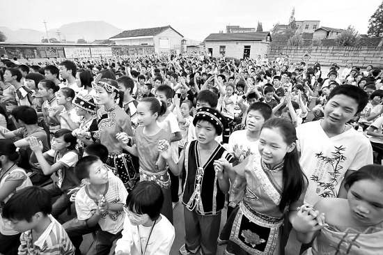 9月23日,缙云县新碧学校的汉族学生与少数民族学生一起合唱《爱我中华》。当天,该校举办了“民族团结一家亲”大联欢,喜迎新中国成立60周年。 尚雄 卢庆红 聂伟霞 摄