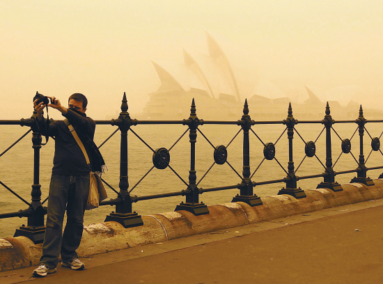 9月23日,在澳大利亚悉尼,一名行人以沙尘中的悉尼歌剧院为背景自拍。 新华社发