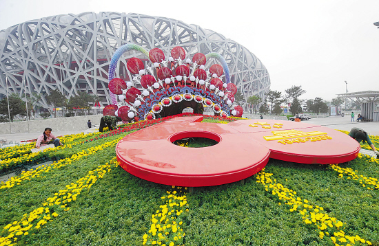 北京奥林匹克公园各项国庆景观的布置工作目前已基本就绪。国庆期间,在各色花卉装点下的奥林匹克公园将以优美的景观、浓厚的节日气氛,盛装迎接各地宾朋。图为鸟巢旁京剧凤冠造型的“九州同庆”主题花坛。新华社发