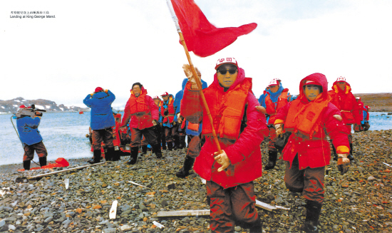 考察队员登上南极乔治王岛。