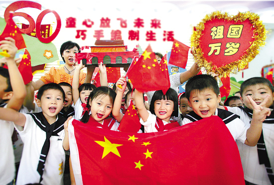 9月30日,杭州朝晖五区幼儿园的师生开展“祝福祖国——喜庆新中国60周年”系列主题教育活动,祝福伟大的祖国繁荣昌盛。