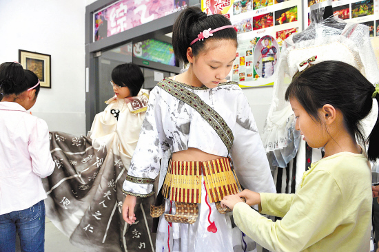 | 10月8日下午,在宁波市青少年宫百艺坊,10余名小同学在指导老师的辅导下设计和制作DIY服饰。为迎接即将在本月举行的宁波市第九届少儿服饰文化节,他们以“书藏古今,港通天下”为主题,从宁波悠久的藏书文化中得到灵感,融入了竹简、活字印刷、甲骨文等设计元素,用麻绳、竹条、宣纸、棉丝布等材料设计制作了10多套DIY服饰。 记者 吴晓鹏 通讯员 刘波 志定 摄 |