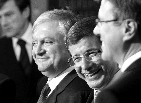亚美尼亚外长纳尔班江(右三)和土耳其外长达武特奥卢(右二)在签署两国关系正常化协定后微笑。 新华社发