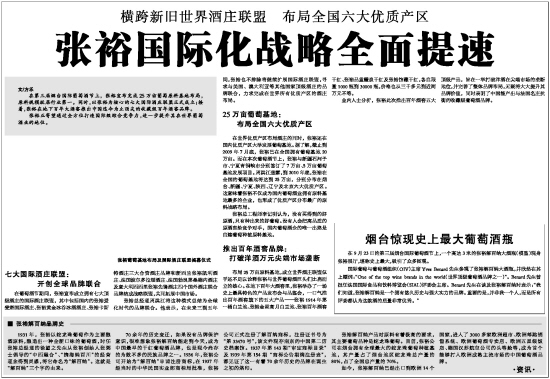 张裕总经理周洪江将这种模式总结为全球化时代的品牌联合。他表示,在未来三到五年间,张裕也不排除将继续扩展国际酒庄联盟,寻求与美国、澳大利亚等其他国家顶级酒庄的品牌联合,力求完成在世界所有优质产区的酒庄布局。