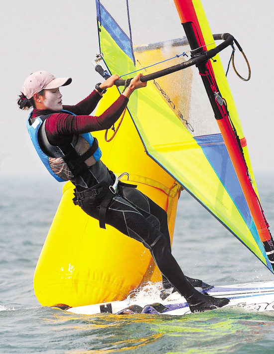 10月22日,浙江队选手王水佳在比赛中。当日,在第十一届全国运动会帆板女子米氏级场地赛中,王水佳以净总分12分暂排第二。 新华社记者 王颂 摄