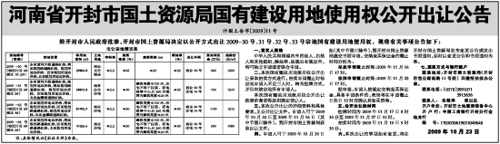 经开封市人民政府批准,开封市国土资源局决定以公开方式出让2009-30号、31号、32号、33号宗地国有建设用地使用权。现将有关事项公告如下: