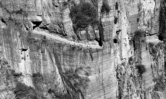 | 10月22日,游人从郭亮村的绝壁长廊中走过。太行山大峡谷中的“绝壁长廊”位于河南省辉县市境内,这曾经是郭亮村通向外界的唯一通道,目前已成为太行山峡谷的著名旅游景点。从1972年开始,号称“13壮士”的辉县郭亮村13名青年在村民帮助下钢钎凿赤岩,铁锤破石壁,花5年的时间在119米高的峡谷绝壁中间打出一条1250米长、5米宽、4米高的绝壁隧道,被称为“绝壁长廊”。长廊开凿35个天窗,当初是为了清理石渣、通风透光,后来成了观景台。“绝壁长廊”改变了郭亮人的命运,也创造了交通史上的一个奇迹。 新华社发 |