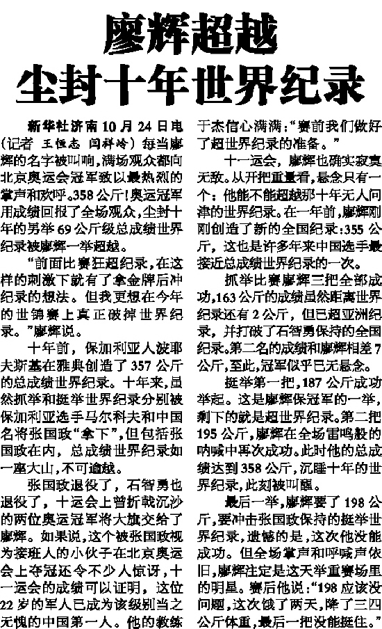 新华社济南10月24日电 (记者 王恒志 闫祥岭) 每当廖辉的名字被叫响,满场观众都向北京奥运会冠军致以最热烈的掌声和欢呼。358公斤!奥运冠军用成绩回报了全场观众,尘封十年的男举69公斤级总成绩世界纪录被廖辉一举超越。