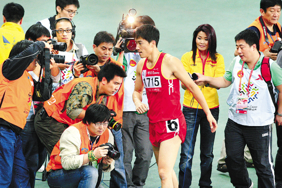 图为刚结束比赛,刘翔就成为媒体追逐的焦点。