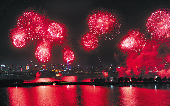 昨晚,五彩缤纷的烟花照亮杭州西湖夜空。 本报记者 黄曙林 邵全海 梁臻 摄(摄于新新饭店七楼)