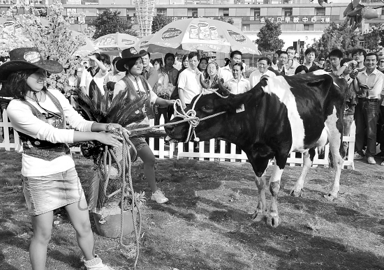 | 绿油油的牧草,硕果累累的果树,憨态可掬的奶牛,还有无数人虎视眈眈在旁边候着“秒杀”……这个场景是不是十分眼熟?10月25日下午,风靡网络的“开心农场”游戏搬到了宁波天一广场,逼真的模仿让市民开心不已。记者获悉,这是某公司为了推销其果粒牛奶新产品而想出的策划。 龚国荣 摄 |