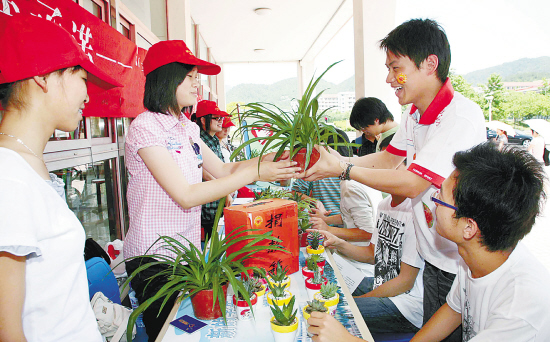 浙江林学院环保志愿者们在校园里义卖植物,所有的义卖款将全部捐给中国绿色碳基金,以支持我国植树造林、节能减排等各种环保项目的开展。陈胜伟 摄