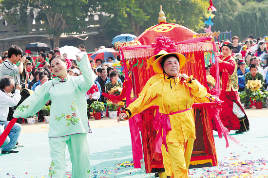 10月28日,磐安县深泽乡农民把反映婚姻嫁娶的民俗节目《四轿八车》搬上了擂台,和其他乡镇的20多个节目进行大比拼。