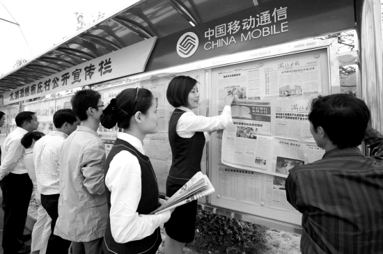 | 昨日,中国移动临安分公司职工与南庄村村民一起在刚落成的宣传栏张贴《浙江日报》。为支持临安太湖源镇南庄村新农村宣传文化建设,中国移动临安分公司出资为该村建起10米长的“村务公开及宣传栏”,用于党报宣传、村务公开、信息交流。 本报记者 季叶海 摄 |