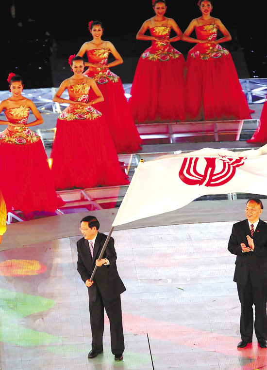④第十二届全国运动会承办地代表、辽宁省省长陈政高(左)挥动中华人民共和国运动会会旗。