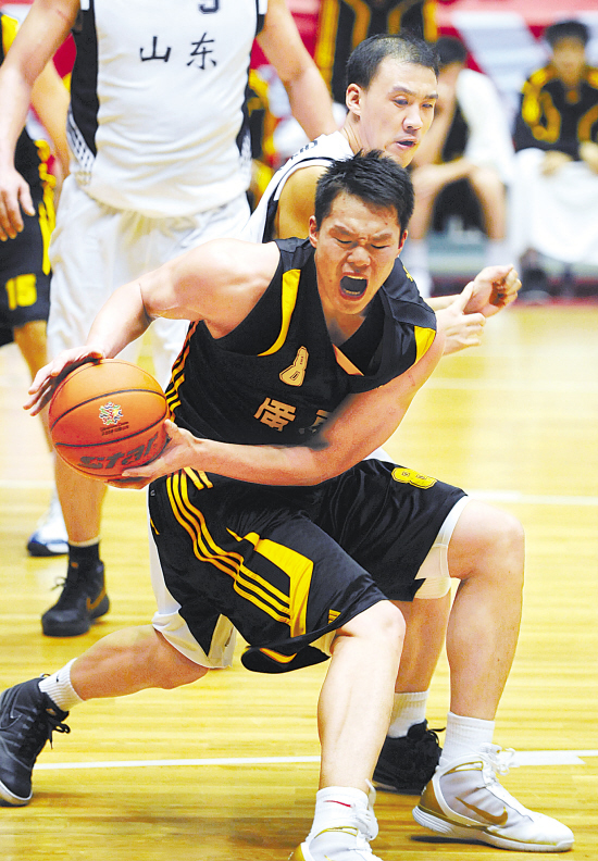 10月28日,广东队朱芳雨(前)在比赛中拼抢。当日,在第十一届全国运动会男子篮球决赛中,广东队以81比76战胜山东队获得金牌。这是本届全运会产生的最后一块金牌。