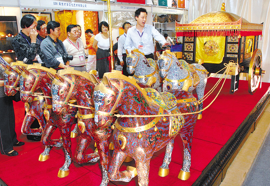 | 10月29日,第十届中国工艺美术大师作品暨国际艺术精品博览会在杭州和平国际会展中心开幕。展览汇聚了全国31个省、市、自治区的400多家工艺美术企业、380多位国家和省市级工艺美术大师参展。图为陕西工艺美术大师胡振西设计的珐琅彩大唐皇家马车。 本报记者 吴元峰 摄 |