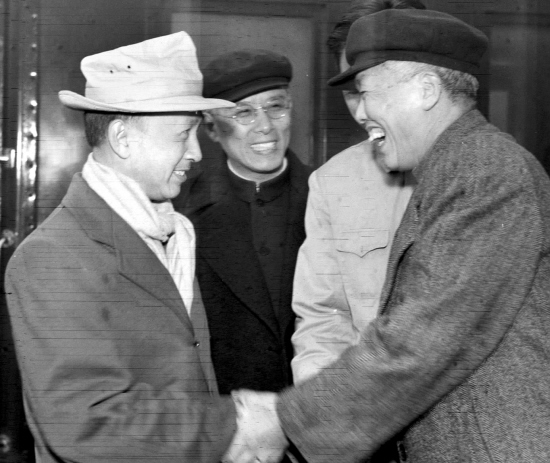 1955年10月28日,从美国返回祖国的钱学森(左)到达北京,中国科学院副院长吴有训等前来迎接。