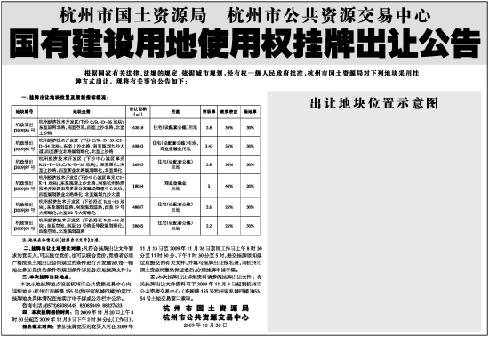 五、本次挂牌出让详细资料请参阅挂牌出让文件。有关挂牌出让文件资料可于2009年11月9日起到杭州市公共资源交易中心(东新路155号和平家私城四楼)B53、54号土地交易窗口索取。
