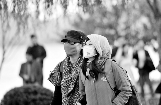 11月2日,受北方强冷空气影响,杭城气温骤降。在西湖白堤游玩的两位游客戴上了口罩、围巾。 本报记者 吴元峰 摄